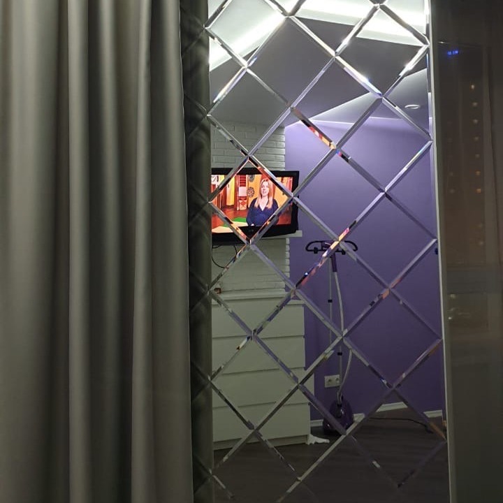 Использована квадратная серебристая зеркальная плитка размером 18х18.