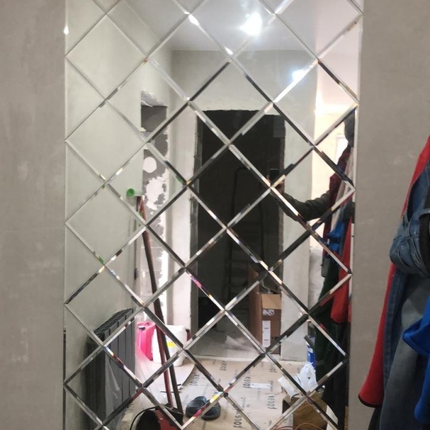 Использовалась серебристая зеркальная плитка формы "вытянутый ромб".